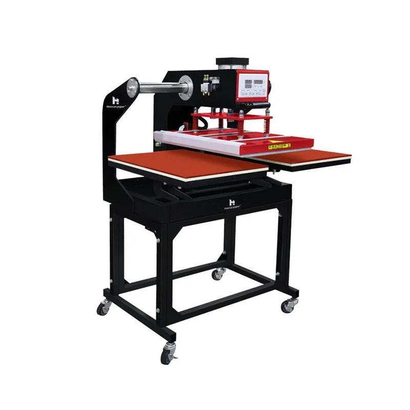 Plancha transfer profesional para sublimación y DTF, con dos platos de 40x60cm, desplazamiento manual y accionamiento vertical con aire comprimido.